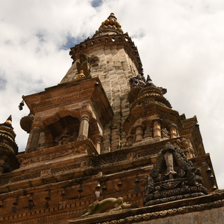De Durbar Square, een plein waar over een week of drie 8 Ossen en meer dan 100 geiten stuk voor stuk met een mes onthoofd gaan worden, een schouwspel waarvan ik niet zeker weet of ik het spannend of griezelig vind en dat we zowiezo niet gaan zien omdat we dan in de bergen zitten, gaat nog letterlijk gebukt onder de gevolgen van de grote aardbeving in 2015. Sommige tempels zijn weer gerestaureerd, andere liggen nog in puin. Er zijn verschillende historische gebouwen die vervaarlijk voorover zijn gaan hellen, en die nu gestut worden door scheef ertegenaangeplaatste boomstammen. Sinds de grote ramp rusten ze op stokken, als oude mannetjes op hun kruk. De trapvormige, naar boven steeds smaller wordende tempels stammen gedeeltelijk uit de middeleeuwen. Je mag ze gewoon beklimmen, de trappen zijn versierd met beelden van goden, van oliefanten, van fabelwezens. Ik voel me als in een boek uit mijn kindertijd, Mowgli in de apentempel, de vormen zijn precies hetzelfde, alleen de jungle mis ik, maar ik heb een voorgevoel dat er zoiets bestaat hier in Nepal, een tempel die door lianen overgroeid is en door apen bewoond wordt, net als in mijn boek van Mowgli, dat nogsteeds in mijn boekenkast staat, klungelig in elkaar geknutseld met plakband uit verschillende decennia.